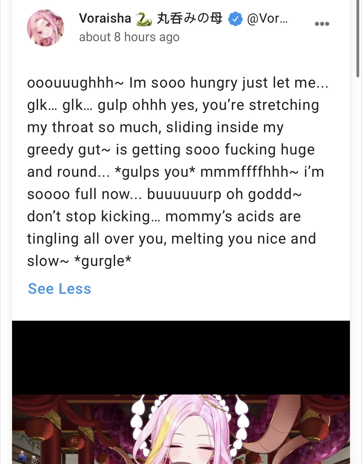 And that damn pea-cock actually temporary broken my heart this year, I thought she is real and phenomenon, like Leah Shutkever, but much more younger, and discovering it's all scam killed my trust in humanity. Actually I just don't care anymore, but now just using her "challenges" as inspirations to Sora animations ideas. For me she still kind of "muse", but I like to schadenfreuding on every time she getting another twitch ban, and her egg streams is good sound libruary for vore anims.